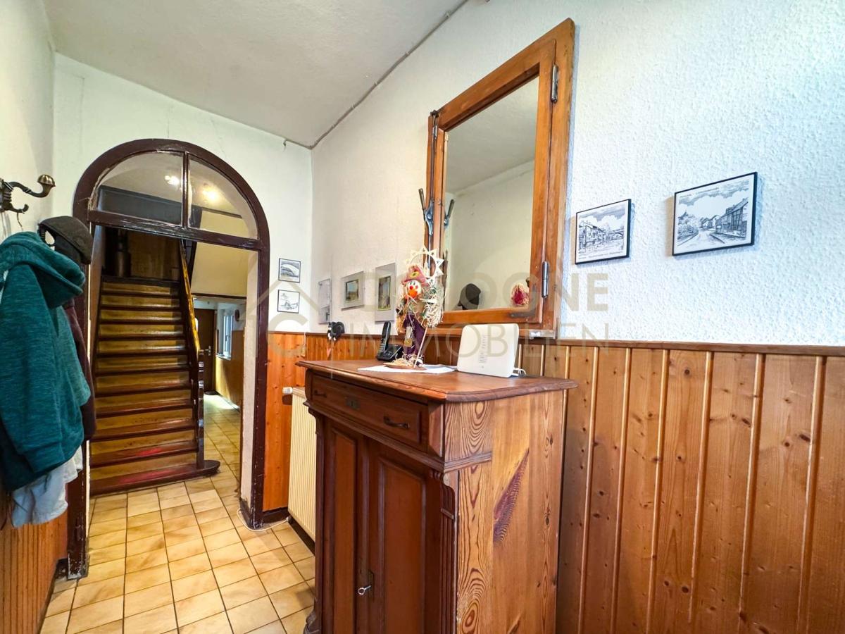 Im Erdgeschoss gelangen Sie von der Diele aus nach rechts in die gemütliche Küche, die direkten Zugang zum praktischen Esszimmer bietet. Geradeaus auf der linken Seite bietet sich unter der Treppe eine praktische Abstellkammer sowie ein Zugang zum Keller. Weiter geradeaus betreten Sie den Anbau, der ca. 1956 nachträglich errichtet wurde. Hier befindet sich auf der linken Seite ein Waschraum, der ursprünglich ein Gäste-WC war - sämtliche Anschlüsse sind weiterhin vorhanden. Dem Flur weiter folgend gelangen Sie in den Innenhof, mit Wintergarten, Werkstatt und kleiner Rasenfläche.